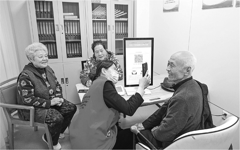 近日,老人们在淄博市张店区马尚街道金石社区日间护理中心测量健康数据。