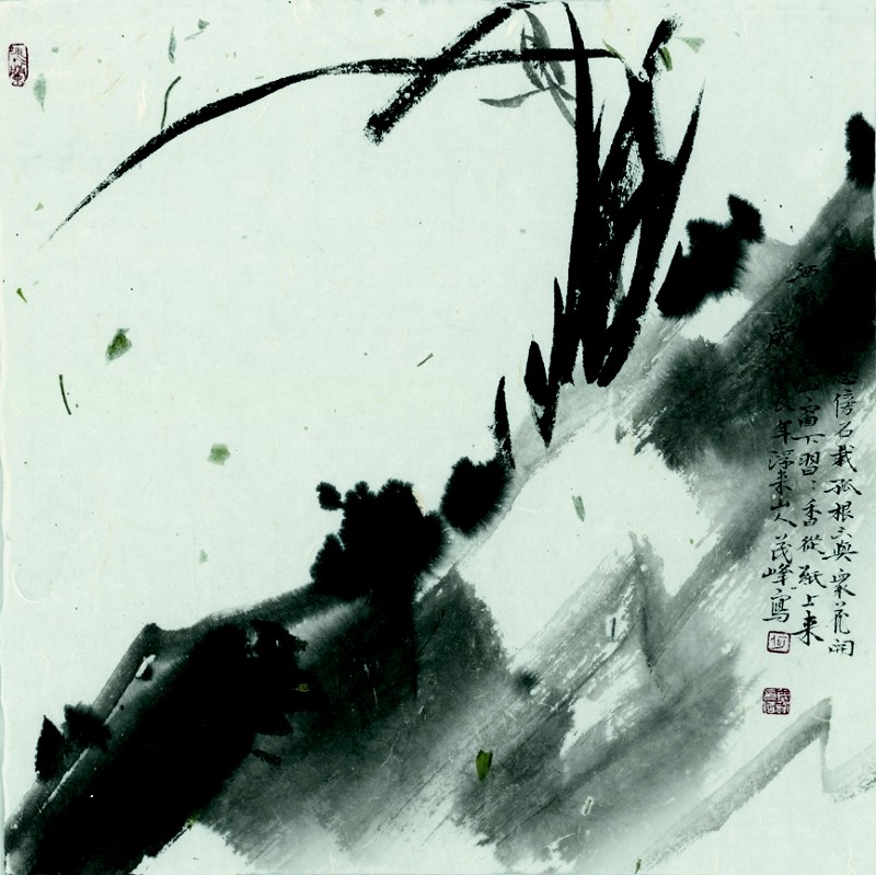 何茂峰画兰的第二系列,是独具意趣的兰石系列。他以石为骨、以兰为魂,借二者相生相伴的天然意趣,既画出兰草扎根大地的本真之美,更暗合君子“刚毅与清雅共生”的品格追求。《唯君心地有芝兰》堪称此系列的代表作。画家以饱蘸湿墨的笔锋,在画幅底部勾勒出一尊奇石,石形朴拙却见筋骨;又于一竖一横两块奇石的缝隙间,让一丛兰草顺势而生——兰根似要冲破石隙、深扎大地,汲取天地养分,而后茎叶挺拔向上,直抵画幅上端,亭亭玉立间似有迎风起舞之姿。整幅画以“石之坚”衬“兰之柔”,将“扎根大地、抒情长天”的生命力具象化,观之令人心生振奋。