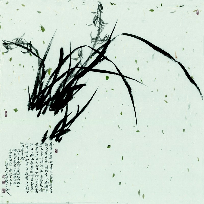 何茂峰画兰的第三系列,是突破常规的“无苔之兰”。在传统书画语境中,青苔多象征着湿润、繁复的尘世肌理,何茂峰的“无苔之兰”恰好剥离了这种尘世的附着感。兰草的叶片如剑般舒展,花瓣似玉般轻盈,没有青苔的斑驳点缀,画面瞬间褪去了烟火气,只余下纯粹的线条与留白交织,既显“干净”的视觉通透,又藏“空灵”的诗意留白。观者凝视之时,仿佛能透过纸面,想象这株兰草生长在云深雾绕的山涧,或是月照清辉的石畔,清风拂过便有暗香浮动,这份留白所催生的想象,正是“无苔之兰”最动人的韵味,其新作《珍爱韶华惜翠阴》便是此系列的典范。画面布局中,下部以工整小楷题诗,笔锋温润如玉,每一个字都透着沉稳的书卷气,与上部兰草 “动若清风”的灵动形成鲜明对比,“动与静”的呼应在此刻愈发鲜活:兰草是自然的生机,书法是人文的沉淀,二者相融,恰如君子“外有风骨,内有涵养”的品格写照。