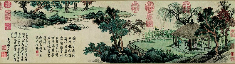 重阳节,自古以来便是文人墨客抒发情感、寄托情怀的重要节日。在这一天,人们登高远眺、赏菊饮酒、插茱萸,以祈求健康长寿、驱邪避灾。而沈周的 《盆菊幽赏图》,则将重阳节的闲适与诗意展现得淋漓尽致。画中人物的神态与动作,无不透露出一种悠然自得的心境。他们远离尘世的喧嚣,在这清幽的茅亭中,以菊为伴,以酒为媒,畅谈人生,对弈取乐。这种闲适的生活状态,正是古代文人所追求的一种精神境界。