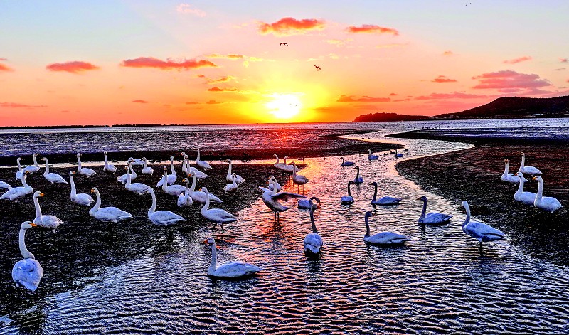 11月2日,在荣成市成山镇天鹅湖湿地,大天鹅在栖息、觅食。