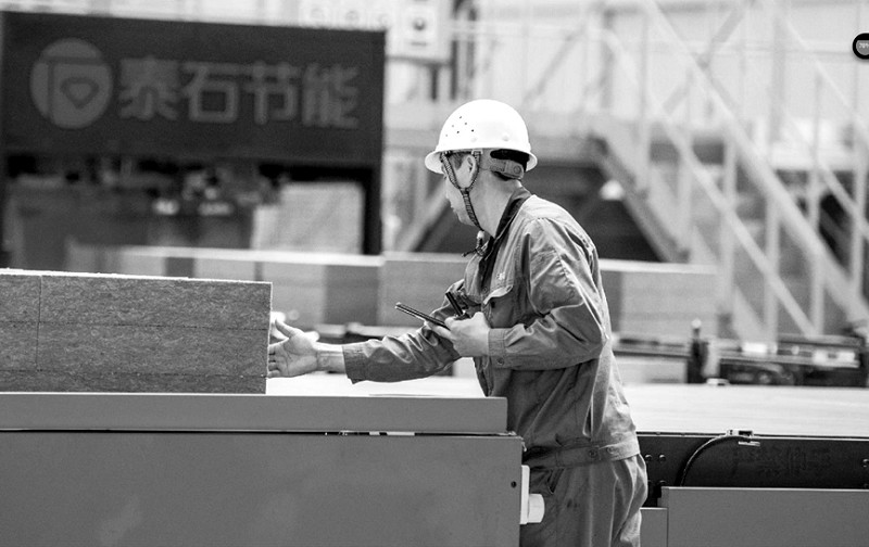 近日,在泰安市岱岳区大汶口工业园泰石节能材料股份有限公司,一名工人在岩棉生产后工段区域,手持工具对岩棉板材进行人工抽检,确保产品符合生产标准。
