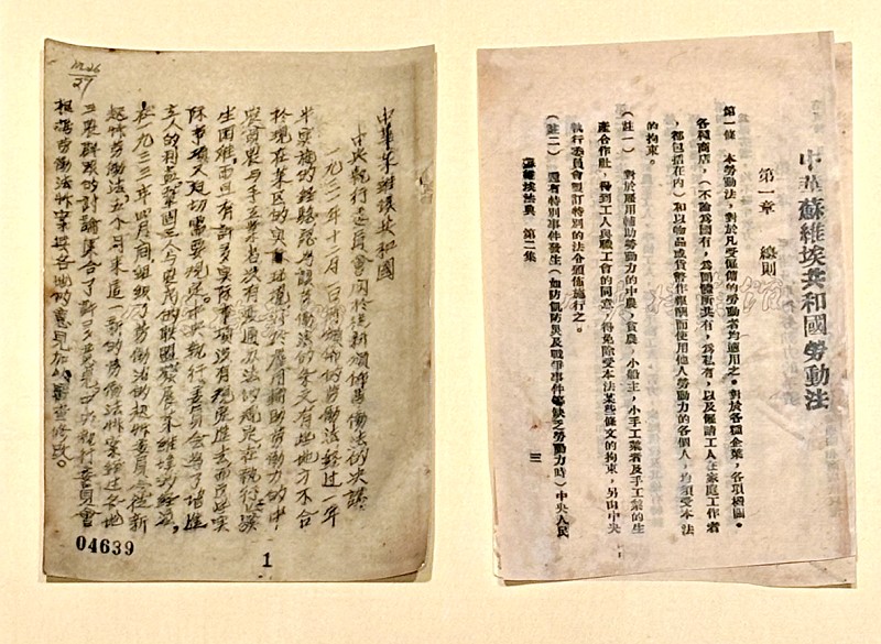 在中国工人运动历史和发展成就展的醒目位置,并排陈列着两件革命文献:1931年11月颁布的《中华苏维埃共和国劳动法》与1933年10月通过的《中华苏维埃共和国中央执行委员会关于重新颁布劳动法的决议》。这两部泛黄的法典,记录着中国共产党在创建红色政权初期,为保障工人权益所进行的艰辛探索。