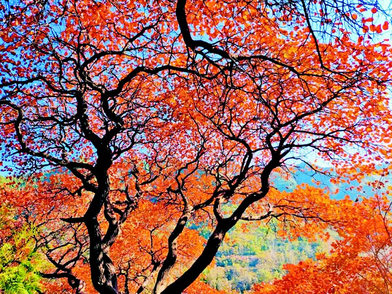 初冬微风吹拂,金色的阳光缓缓升起,温柔地照耀着石安峪村。站在山巅放眼远眺,漫山红叶犹如红色海洋将山乡小村笼罩其中,这时的村子,又像极了一首流光溢彩的诗。