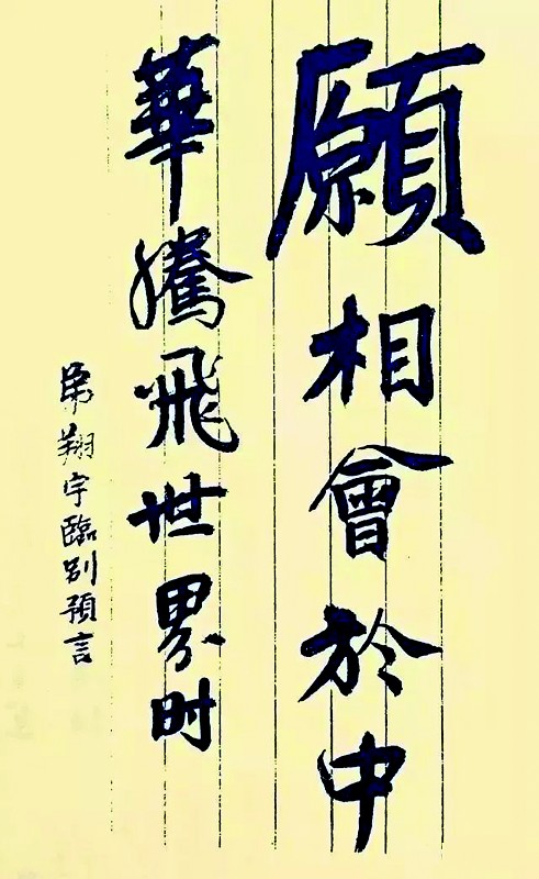 周恩来 (1898—1976)原籍浙江绍兴,生于江苏淮安。半岁时,过继给小叔周贻淦,从此称嗣母陈氏为娘,称亲生父母为干爹干娘。自幼受到严格教育,5岁习书,日练百字,悬肘握笔,刻苦勤奋,并且立下了 “为中华崛起而读书”的伟大志向。早年在天津南开中学读书时,作文手稿中的书法功底扎实,小楷字型端正,笔力遒劲;行楷运笔娴熟,端庄朴茂,灵动流畅,授课老师称许不已: “笔酣墨饱,气势汪洋,青年有此文字,后日必不可限量矣。”1917年8月30日,时年19岁的周恩来东渡日本前,为同学郭思宁题写了 “愿相会于中华腾飞世界时”的赠言,落款 “弟翔宇临别预言”,行楷相间,大小错落,秀外慧中,刚俊挺健,不乏魏碑风骨。其中,第一个字 “愿”书写最大,彰显出周恩来自出机杼的艺术情趣和炽热赤诚的鸿鹄之志。