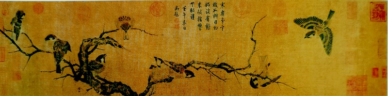 《寒雀图》上有清代乾隆题诗:“寒雀争寒枝,如椒目相妒。设有鹤来驱,仇共救护。”从图上的印章看,有南宋贾似道的“悦生”葫芦印,清嘉庆帝御览玺印等多方。图上的这题诗及众多印章,从一个侧面反映了《寒雀图》从北宋流传下来的不易历程,更见《寒雀图》之弥足珍贵。