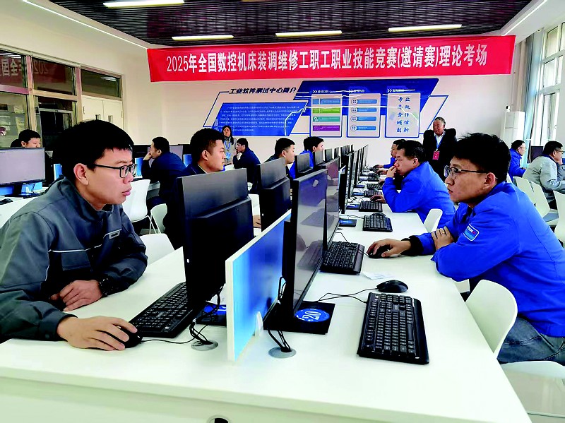 11月21日至23日,由中国职工技术协会、山东省总工会、省发改委、省工信厅、省人社厅主办,枣庄市总工会、枣庄科技职业学院承办的2025年“鲁工杯”城市主导产业职业技能竞赛全国数控机床装调维修工职工职业技能竞赛在滕州市举办。来自全国各地的50余名行业优秀技能人才同台竞技,展现精湛专业技能。图为理论考试现场。