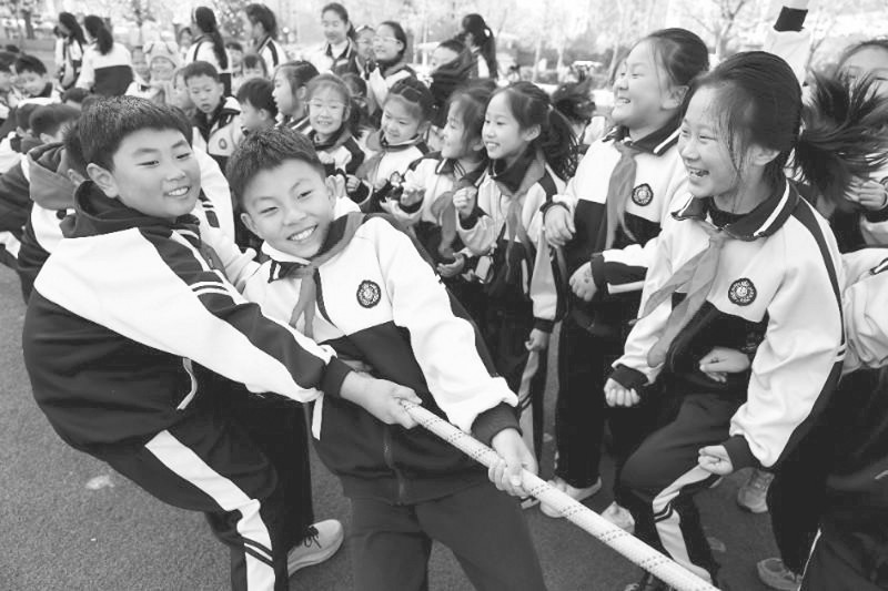 11月27日,在枣庄市市中区东湖小学,学生们利用课间进行拔河比赛。