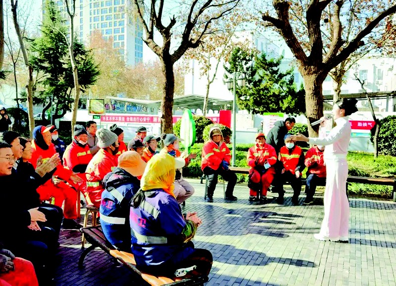 12月5日上午,在潍坊市潍城区城关街道颐园工会驿站前,环卫工人们围坐成圈,观看全总文工团演员们带来的精彩节目,生动的表演让现场笑声连连、掌声不断。