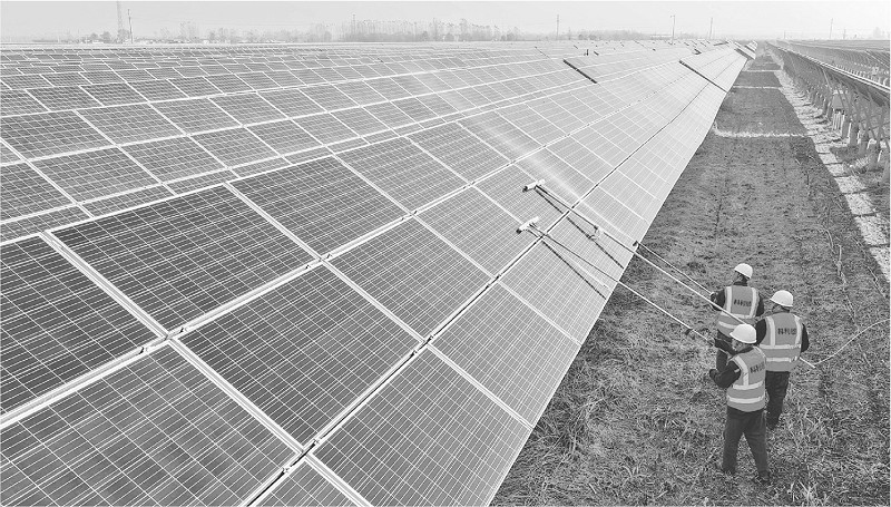 近年来,聊城市茌平区充分利用盐碱地、废旧窑坑等因地制宜发展光伏新能源产业,探索“渔光互补”“农光互补”等模式,持续输出绿电,点亮“绿色经济”,激活土地潜力,扩宽农民增收渠道。图为近日的茌平区肖家庄镇算子李村农光互补项目现场,光伏板连接成片,蔚为壮观。 (本报通讯员 马红坤 摄)
