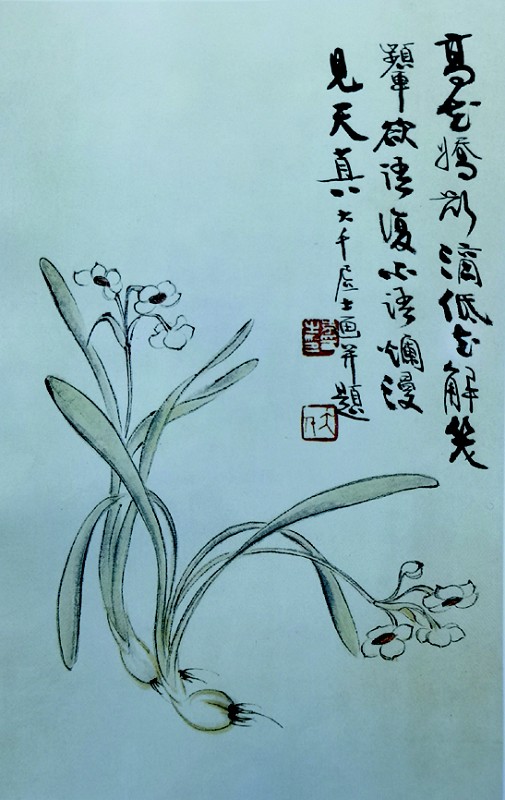 水仙开花于新年之际,被视为新岁之瑞兆,也是吉祥之花。水仙,因与 “谁先发”谐音,民间视之有“发家致富”寓意。又因 “仙”字蕴含吉利之意, “水仙”被视为吉祥如意之象征,在绘画中,水仙与寿石搭配,寓意 “群仙拱寿”;水仙与寿石、竹子搭配,寓意 “仙祝长生”;水仙与牡丹搭配,寓意 “神仙富贵”。正因如此,水仙深受人们喜爱,更成为画家作画的好题材,张大千喜爱画水仙,就是其中之一。