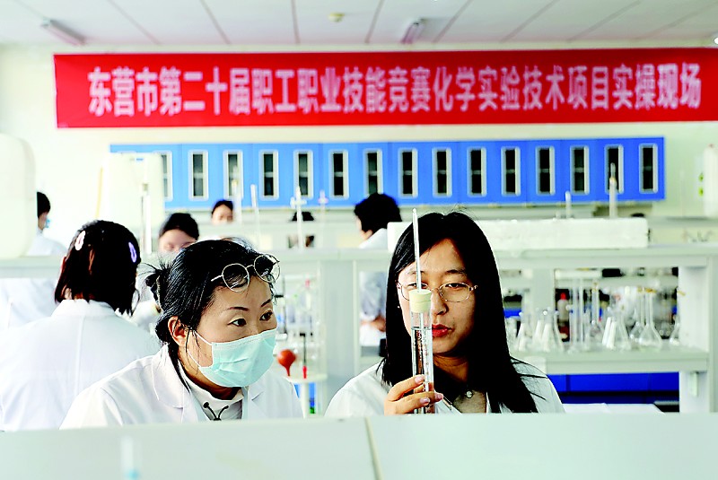 12月17日-18日,东营市第二十届职工职业技能竞赛举办。竞赛由东营市总工会、市人力资源社会保障局主办,围绕石油化工、石油装备、造纸、新能源、大数据等行业,设置普通车工、数控车工、造纸工等17个工种,410余名职工参加。今年以来,东营市总以“建功黄河口 逐梦新征程”创新创优劳动竞赛和职工职业技能竞赛为统领,聚焦服务黄河重大国家战略,围绕重大工程、重大项目、重点产业,将7项竞赛列入省级“鲁兴杯”劳动竞赛项目,96项纳入市劳动和行业竞赛项目,在全市掀起了比学赶超的技能提升热潮。图为化学实验技术项目竞赛现场。 (本报通讯员 东工宣 摄)