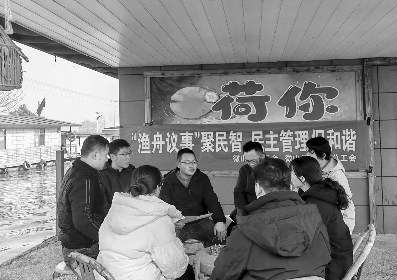 12月17日,微山县总工会联合高楼乡总工会在渭河村渔船上开展 “渔舟议事”民主管理活动。职工代表围绕渔业安全、技术培训、基础设施等提出10条建议,其中8条现场达成解决方案,其余明确责任与时限。活动发放工会服务资料,现场解答职工咨询,让湖区职工诉求有回应、办事有实效。 (本报通讯员 陶熳 摄)