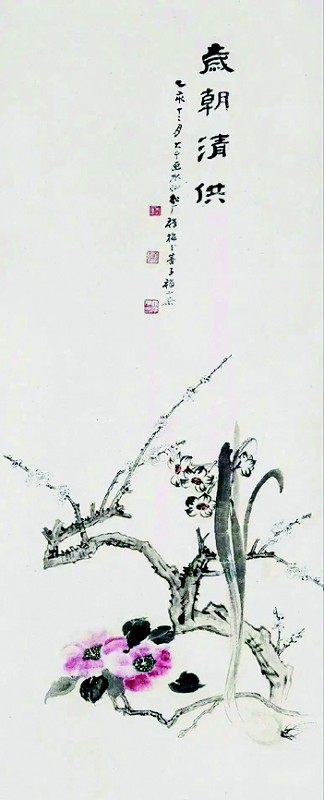 岁朝清供,以其美好寓意,历来为我国文人雅士所青睐,并不惜笔墨加以弘扬。晚清民国时期著名画家吴昌硕几乎每年正月初一都会画《岁朝清供》图,且变化组合颇多,金石、古器、盆景等皆为其入画内容,并配以梅花、水仙、石榴、佛手、枇杷等。他曾于八十岁时,创作了一幅《岁朝清供》图,画中绘梅花、牡丹、兰草、荔枝、如意,充溢着岁朝时节的吉庆氛围,其所含蕴义,恰如画中所题:“贵寿无量,子孙富昌。岁朝清供,春风满堂。”