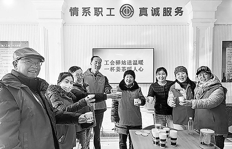 上图:近日,青岛市城阳区惜福镇街道盛苑社区工会驿站组织开展了以 “一杯姜茶的暖意”为主题的冬日送温暖活动,为严寒中坚守岗位的户外工作者送去热茶与关怀。图为活动现场。
