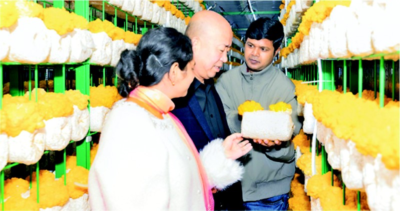 日前,在临清金耳种植方舱基地,专家 (中)向外国友人讲解金耳种植。