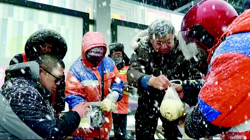 近日,威海迎来寒潮天气。坚守在一线的外卖员、快递小哥、环卫工人等牵动着“娘家人”的心。威海各级工会纷纷为一线职工送去防寒物资,实现跨越寒冬的暖心奔赴。图为工会工作人员为清雪一线的环卫职工送去热腾腾的肉包子和小米粥。 (本报通讯员 陈凤高 摄)