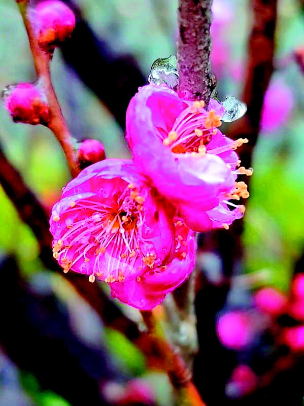 红梅含笑迎冻雨。冻雨在红梅花蕾、花瓣和枝头凝结,红梅以别致而神奇的姿态,在冰天雪地中一枝独秀。 (本报通讯员 高军 摄)