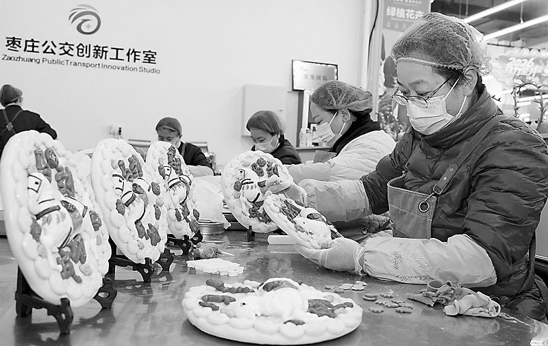 农历马年将至,在枣庄公交创新工作室,民间艺人以小麦面粉、果蔬汁为原料,制作的“马到成功”主题花馍栩栩如生,融观赏性与食用性于一体,为节日增添喜庆气氛,备受消费者青睐。图为1月15日,民间艺人在制作“马到成功”花馍。