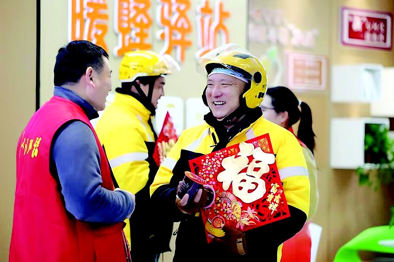 1月26日,在郯城县郯城街道郯中社区“暖蜂驿站”,社区志愿者为外卖骑手送上腊八粥和“福”字。