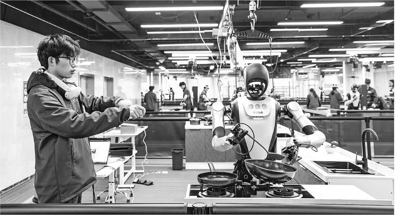 具身智能机器人产业眼下正值风口,但机器人若要正式上岗,也必须经过特定场景的“训练”。于是,数据采集员这一新职业应运而生。据了解,作为核心岗位,该训练场目前共有33名数据采集员,他们扮演着“机器人老师”的角色。通过控制器,他们“手把手”指导机器人学习商超、厨房、汽车制造等不同场景下的特定任务,并在过程中采集有效数据,最后将数据用于模型训练。 (本报通讯员 王培珂 毕胜 白晓 摄)