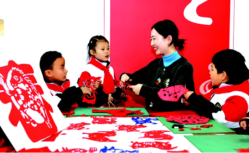 春节临近,我省多地组织开展“非遗进校园 迎新春”主题活动,邀请民间艺人走进校园,传授非遗知识、展示非遗技艺,让学生与幼儿沉浸式感受传统文化魅力,喜迎新春佳节。图为1月29日,在枣庄市市中区红旗小学,美术老师在向学生们传授剪纸技艺。(本报通讯员 孙中喆 陈庆丰 摄)