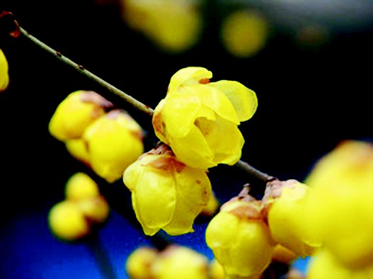 镜头里,盛开的蜡梅在漆黑的夜空下显得更加幽寂,它们有的紧紧挨靠着,有的又那么疏离,却都艳丽而干净,花瓣挺阔,花色金黄,精神抖擞,让人忍不住凑上前去仔细端详,心中竟生出私藏的念头来。