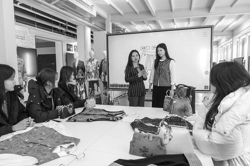 日前,山东轻工职业学院纺织服装全链路数字化实习实训基地内,时尚表演与传播专业学生正在教师指导下,专注学习新中式服装制作技艺。