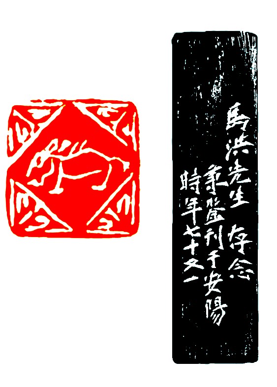 任秉鉴先生赠我这方印章,印面设计颇具特色,似乎吸收了古代画像石和民间剪纸的元素,四角装饰图案,内方形与印石外方形,错落有致,中间刊刻甲骨文“马”字,刀法纯熟老练,线条富于率意,造型简洁生动,极富古雅风韵。甲骨文的 “马”字,是一个象形文字,头、躯、足、鬃、尾俱全,俨然就是一匹马的侧身形象。此印可谓既是一方文字印,又是一方肖形印;既可以作为我的姓氏印,又可作为一枚肖形闲章,一印两用,妙不可言。诚如著名篆刻家叶一苇有诗云: “任翁一字独为印,竟使肖形别出新”。 马洪
