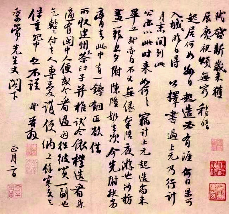 苏轼的《新岁展庆帖》,是我读来最暖心的一帖。元丰四年正月初二,写给好友陈訸(季常)的信札,他在黄州,日子过得不算顺遂,可这通写给朋友的信札,笔墨里没有半分愁绪,反倒全是人间烟火。他写字从不在意“好不好看”,却偏偏最打动人——笔锋圆厚,看着软,实则藏着劲,字写得扁扁的,左低右高,有点憨拙,却格外亲切。信里全是琐事,叮嘱朋友好好吃饭、注意起居,甚至还有涂改的痕迹,就像我们现在给挚友发消息,想到哪说到哪。他把新岁的祝福、对朋友的惦记,都融进了笔墨里,读这帖,就像看见困境中的东坡,依然笑着给朋友拜年,那份豁达与温润,越品越有味道。