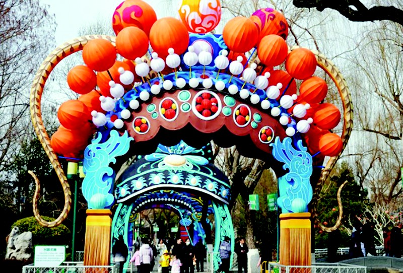 近日,布置在济南城区街道和公园的多组大型彩灯安装完毕,为即将到来的新春佳节增添了喜庆的色彩。图为2月9日,游客在济南天下第一泉风景区观赏大型彩灯。 (新华社记者 徐速绘 摄)