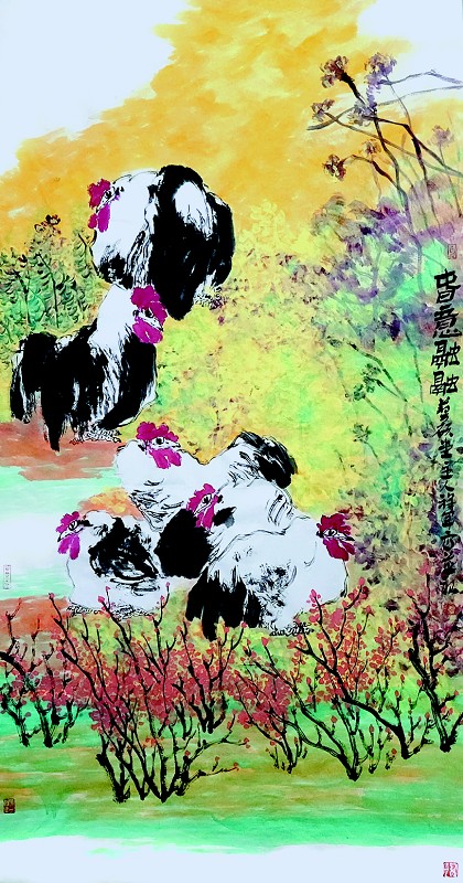 高祥军的花鸟画,既不同于传统文人画的图式,也不同于当前流行的中西融合体的表达方式。他依据艺术创作的普遍原理和传统文论的“意象说”,选择了适合自己个性语言的绘画语言,形成了独特的艺术面貌。他的作品以表达自己的心象,传达象外之意为主。他十分注重形和意的关系,其画作中物象本身所具备的特质,是他对表象的认知和把握,含有相当的主观成分,这便导致了他笔下物象的与众不同,进而创作出了具有雄阔气象的沉雄朴茂、野逸恣肆的花鸟画。在其作品《鸡冠花》中,6朵鸡冠花鲜艳夺目,重墨挥写的枝叶犹如一条条大鸡羽毛,披沥苍驳,雄劲英壮。苍厚的墨韵同老辣的笔力交融共美。下方再点缀山石、花草,令人联想到了雄鸡昂立山头的英武气概和巍峨形象,进而感受到登攀前进的鼓舞之志与刚劲之力。