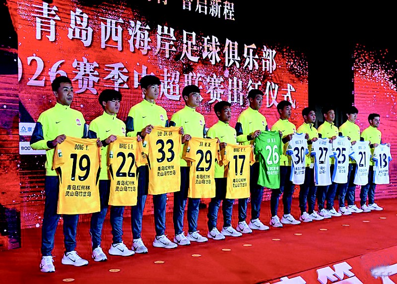 3月4日,青岛西海岸足球俱乐部举行2026赛季中超联赛出征仪式。青岛西海岸队将于3月8日客场对阵浙江队。图为该俱乐部新引进球员在出征仪式上展示球衣。 (新华社记者 李紫恒 摄)