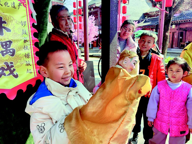 春日,临沂琅琊古城人头攒动,叫卖声、叫好声、鼓掌声此起彼伏,斗鸡、杂技、木偶戏、火秀表演争相上演,大型情景剧《国秀琅琊》《护江山》令人赏心悦目。图为小朋友在玩木偶。 (本报通讯员 苏静 摄)