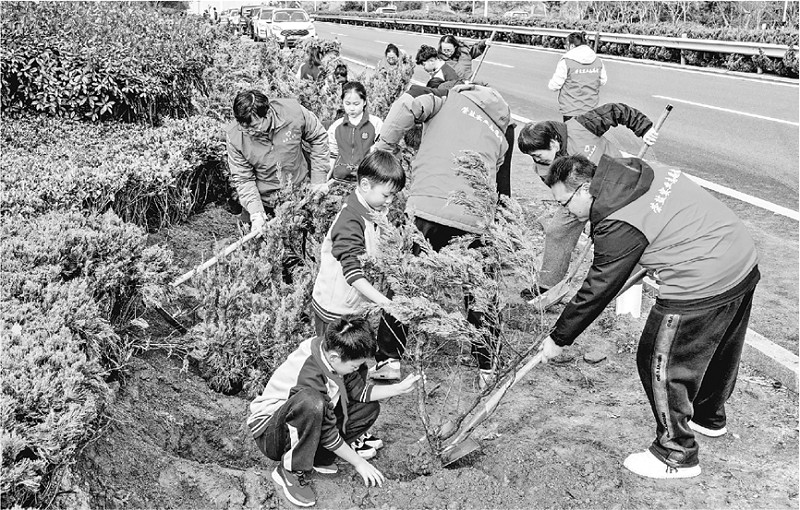 近日,在G206国道旁,荣成市的志愿者与当地小学生携手参加义务植树活动。