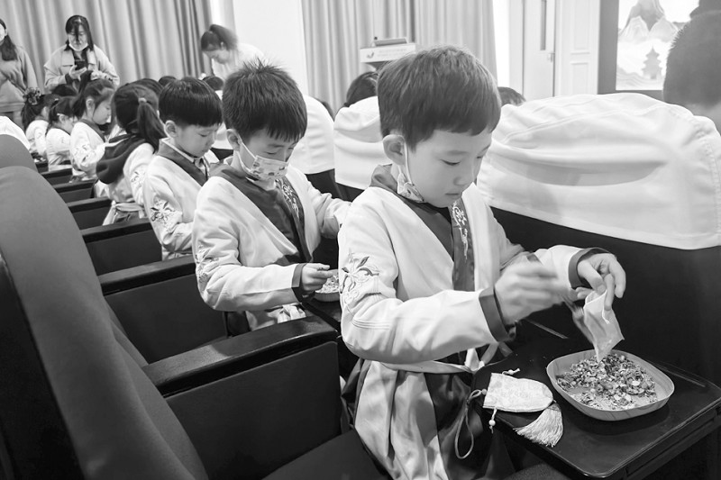 活动中,学生穿上汉服变身为“小小中医师”,通过参观中医药科室、学习中医望闻问切诊疗方法、体验中医适宜技术、辨识常见中草药、自己动手制作香囊等方式,沉浸式感受中医药的独特魅力。