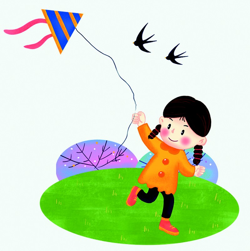 在公园湖边,一位年轻妈妈蹲在地上,教孩子放风筝。那只小小的燕子风筝由孩子举着,跑在前面的母亲边跑边回头喊:“放手!放手!”