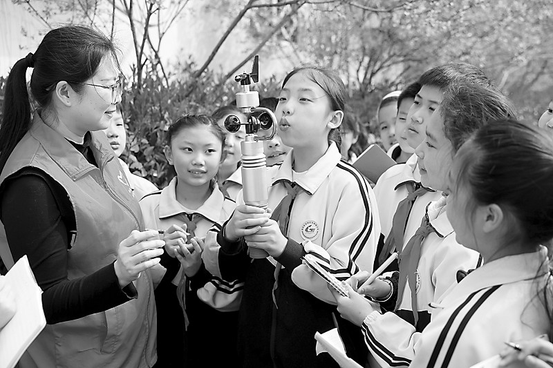 3月23日,枣庄市气象局工作人员在当地光明路小学指导学生体验便携式自动气象站。