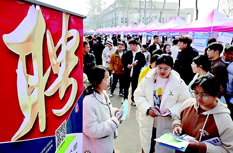 3月21日,在枣庄学院2026年春季双选会招聘活动现场,企业工作人员(左一)向求职大学生介绍用工信息。