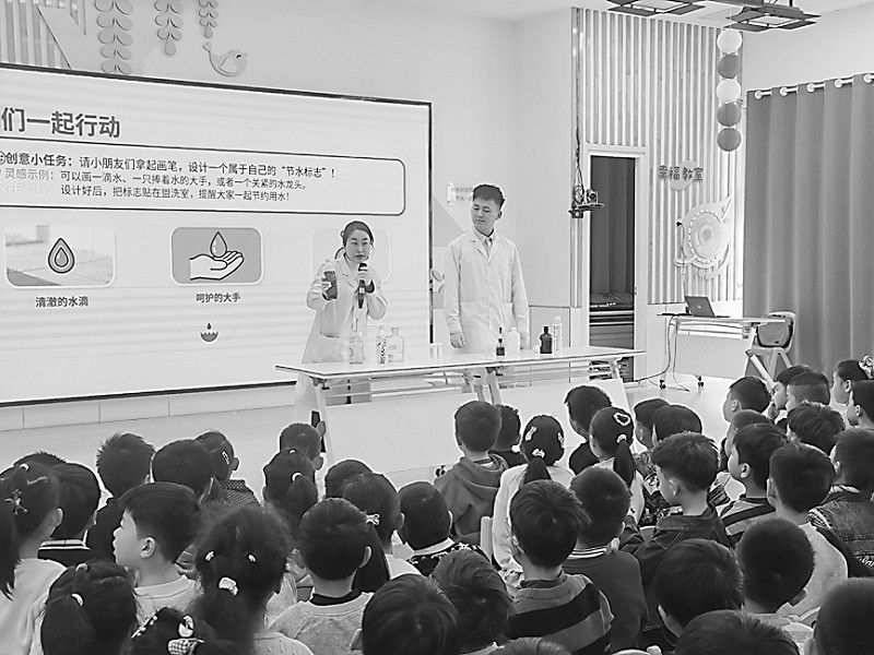 3月22日至28日是第三十九届“中国水周”,主题为“国家水网 世纪画卷”。为普及用水知识和倡导节约用水,引导幼儿从小树立惜水、护水、节水意识,3月24日,青岛胶州自来水有限公司城南供水服务所走进第五实验幼儿园开展关爱校园用水活动,以节水小课堂为载体,开展趣味化、生活化的供水知识科普宣传活动。 (本报通讯员 单亦双 摄)