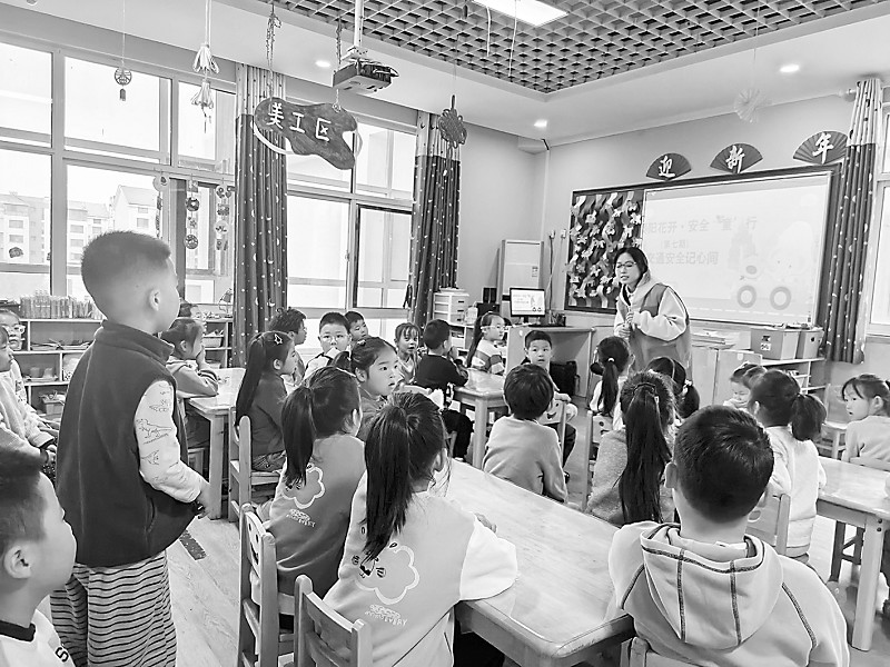 3月31日下午,东营市锦泰社区联合东营职业学院大学生志愿者,到锦苑大地幼儿园开展“泰阳花开 安全童行”第七期交通安全主题活动,切实筑牢校园周边安全防线。图为志愿者与幼儿园“小油娃”互动抢答交通安全知识。