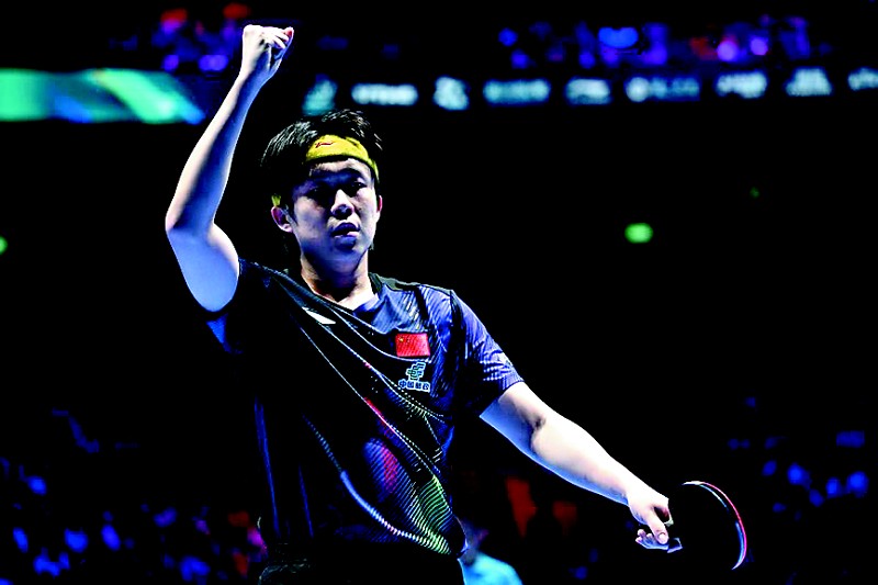 3月31日,在中国澳门举行的2026年国际乒联男子及女子世界杯男子单打小组赛中,中国选手王楚钦3比0战胜罗马尼亚选手爱德华·约内斯库。图为王楚钦在比赛中庆祝得分。 (新华社记者 于洋 摄)