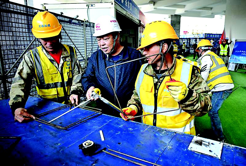 4月8日,在青岛市南京路1号项目比赛现场,一名评委(左二)在钢筋工团体赛中测量钢筋。