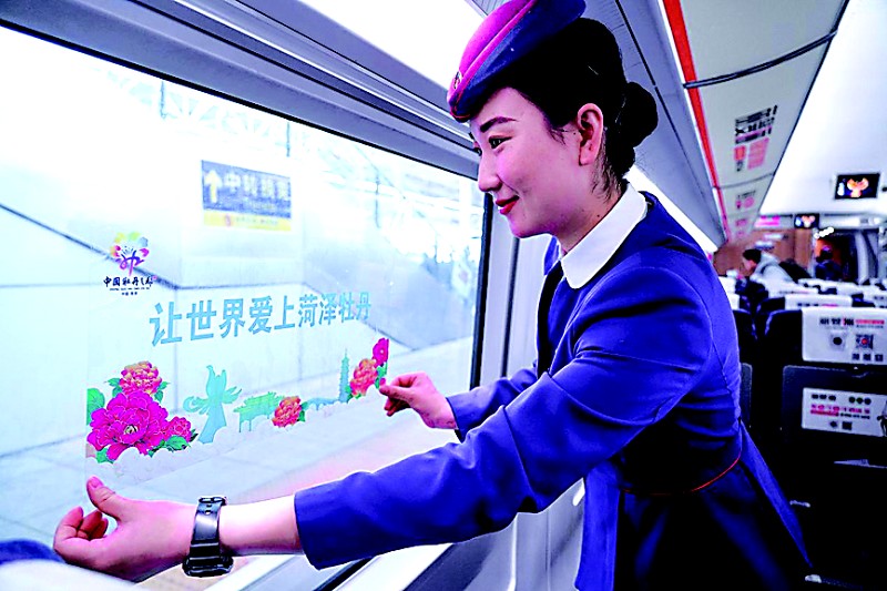 为服务2026世界牡丹大会、第35届菏泽国际牡丹文化旅游节,国铁济南局精心打造的“牡丹号”赏花列车将于4月10日正式开行,以高铁为媒,邀广大旅客共赴牡丹之约、畅享文旅盛宴。图为该专列以“乘高铁·赏国色·游菏泽”为主题,深度融合菏泽牡丹文化与非遗特色,打造沉浸式文旅出行体验。 (本报记者 洪波 通讯员 梁虹 摄)