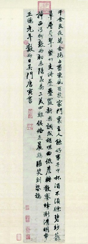 我留心明代书法多年,始终觉得,世人对唐寅的认知,大多停留在他的画作与传奇人生里,却极少有人真正沉下心,去品味他笔下的书法。台北故宫博物院所藏的唐寅行书 《谷雨》诗轴,高140cm,宽25.2cm,狭长的立轴形制,纸张历经数百年,带着温润的古意,墨色沉稳厚重,毫无浮滑之气。这是他中年心境成熟后的作品,没有刻意的炫技,也不固守僵化的法度,全然是随心书写,将谷雨时节江南的烟雨意韵,和文人独有的闲适风骨,尽数融于点画之间。每次品读,都仿佛置身暮春的江南雨巷,温润、沉静,字里行间的烟火气与真情,总能打动人心。