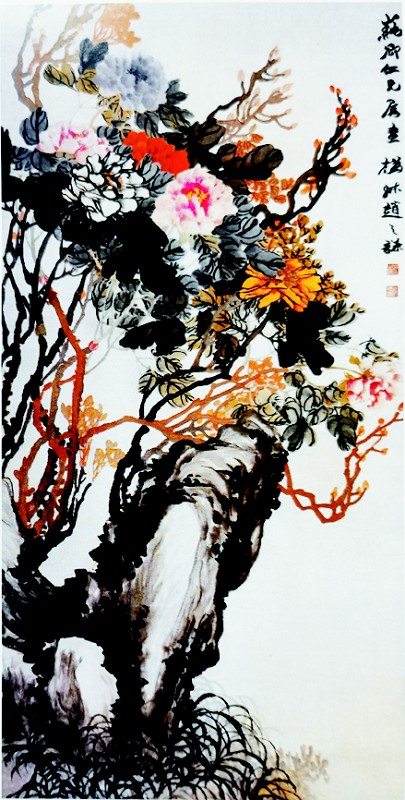 纵观 《牡丹图》立轴,画家设色用笔尽显独特风格。湖石浓墨衬底,焦墨皴擦如碑拓,勾勒圆润谨劲。牡丹的描绘既用没骨画法,又渗以勾线填色之法,两种画法统一在凝重沉厚的笔法中,繁而不乱。敷色善用红、黑、绿等重色,在对比中求协调,更使画面热烈奔放,呈现吉祥富贵之神韵。笔墨坚实,色彩鲜明,别具视觉韵律,彰显了雅俗共赏的艺术魅力,令人望而生情,陶醉不已。