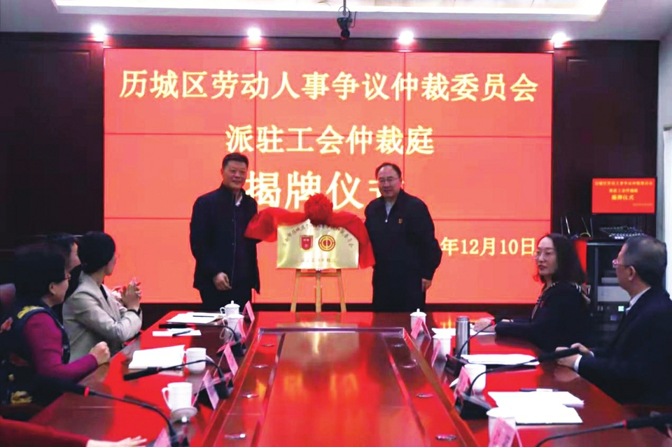 2021年12月10日,济南市历城区劳动人事争议仲裁委员会派驻工会仲裁庭揭牌仪式在历城区工人文化宫举行。此次派驻工会仲裁庭的设立并运行,为职工诉前调解、仲裁、诉讼提供全方位、一站式服务。启动仪式后,仲裁庭进行了首次开庭,审理了一起关于工伤劳动关系处理的劳动争议案件。