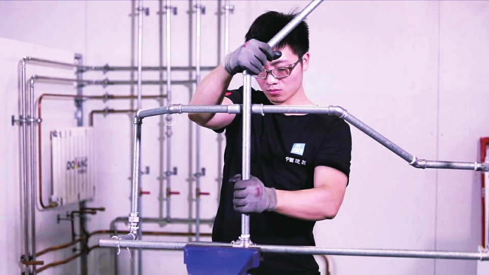 管道与制暖工程是世界技能大赛比赛内容之一,包括为房屋及工业场地安装给水、排水、卫生设施、供暖等管道系统安装,不仅考验参赛者严谨的专业态度,还要具备极强的逻辑思维能力以及对空间的立体感知力。大赛现场的陈宇航自信而沉着,充分展现青年工匠的匠心实力,以完美表现征服了评委,以总分第一名的成绩夺魁。