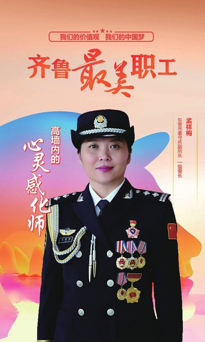 齐鲁最美职工孟祥梅,现任东营市看守所副所长、一级警长,二级警督警衔。2006年参加公安工作以来,她扎根基层监所16年,在环境封闭、任务繁重、风险性高的高墙电网内,她用真心真情先后教育转化1700余名女性在押人员,赢得在押人员及其家属的广泛赞誉。