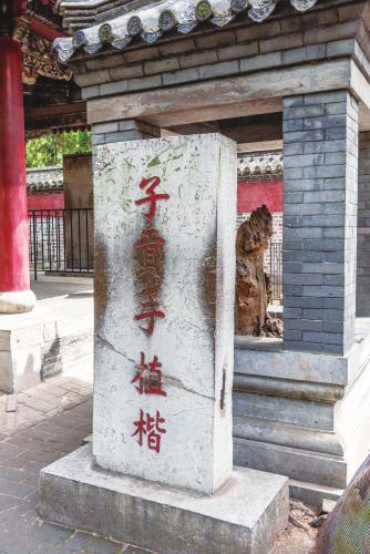 传说生长在孔子墓上的楷树为其弟子子贡所植。据说子贡从老家奔先师之丧时,将一棵从卫国捧来的楷树苗栽于其师墓旁,后成大树。清康熙年间子贡所植的楷树遭雷火焚灭,后人遂将枯干图像刻于石上,碑名“子貢手植楷”。又于石上建亭存碑,亭名“楷亭”(见下图)。图中亭内为子贡手植楷树残留之物。历代的人们对子贡崇敬仰慕,所以那碑上“貢”字被无数虔诚手指抚摸出深深印迹。仔细看看,那“植”右侧还少写一横,不知何故。